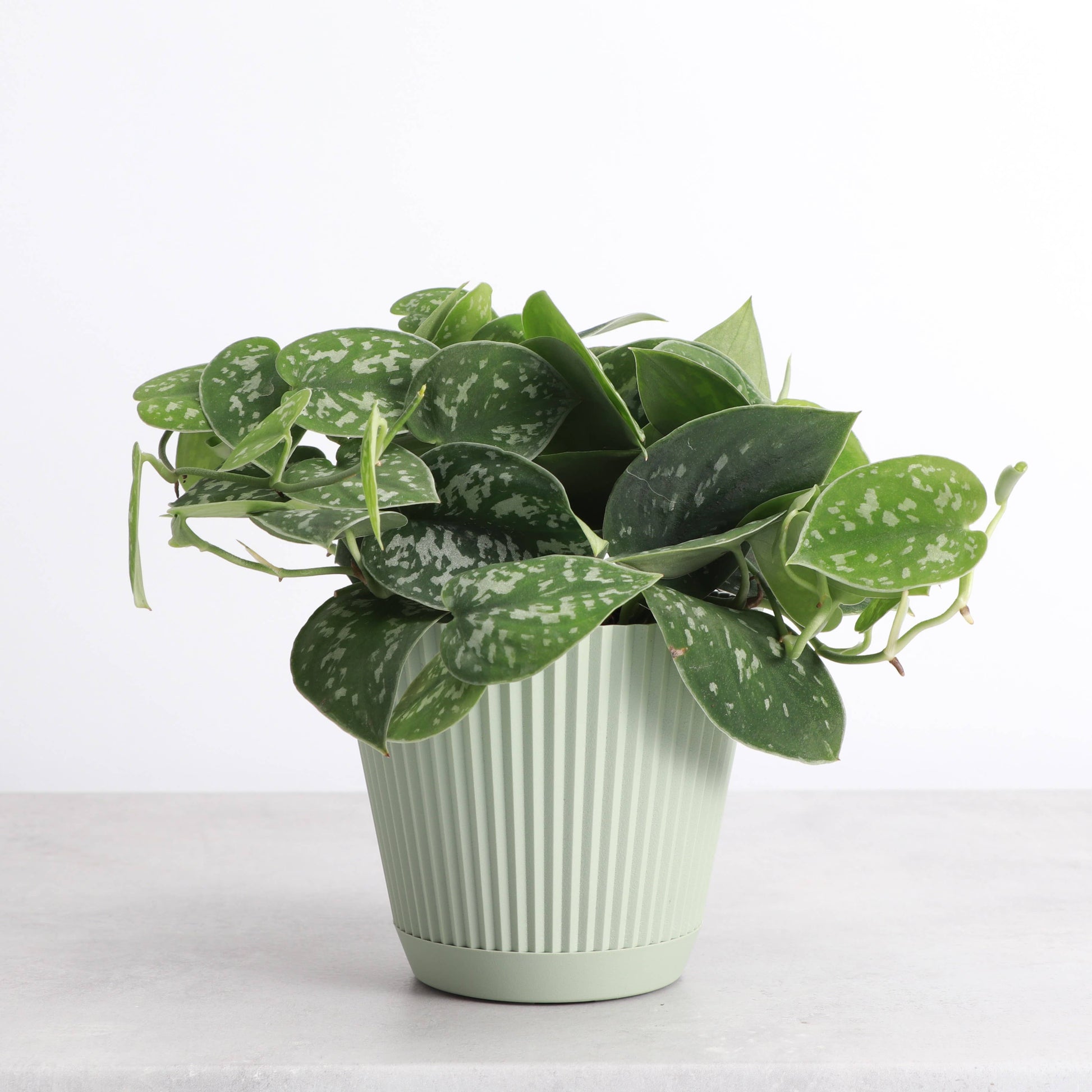 Choose between 3 colors. Pot is made of plastic. Pot has an attached saucer.