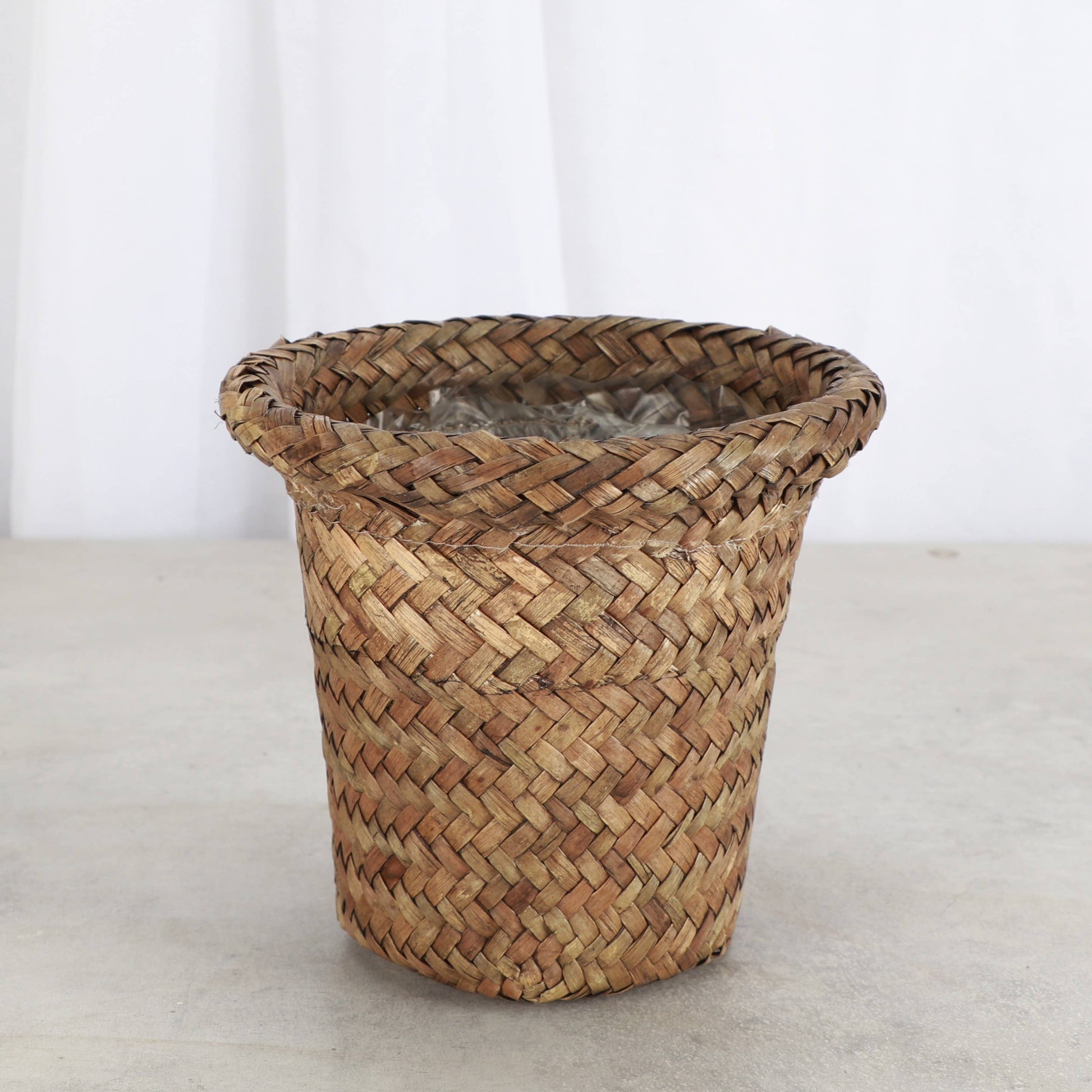 This plastic pot cover perfectly fits a 4-4.5" diameter plant! Made of natural materials with a plastic lining, this woven pot cover elevates your houseplants into a piece of home decor! Choose between 2 shades. This pot is intended to be used as a cache pot, and has no drainage holes. 4.5" diameter, 4.5" height.