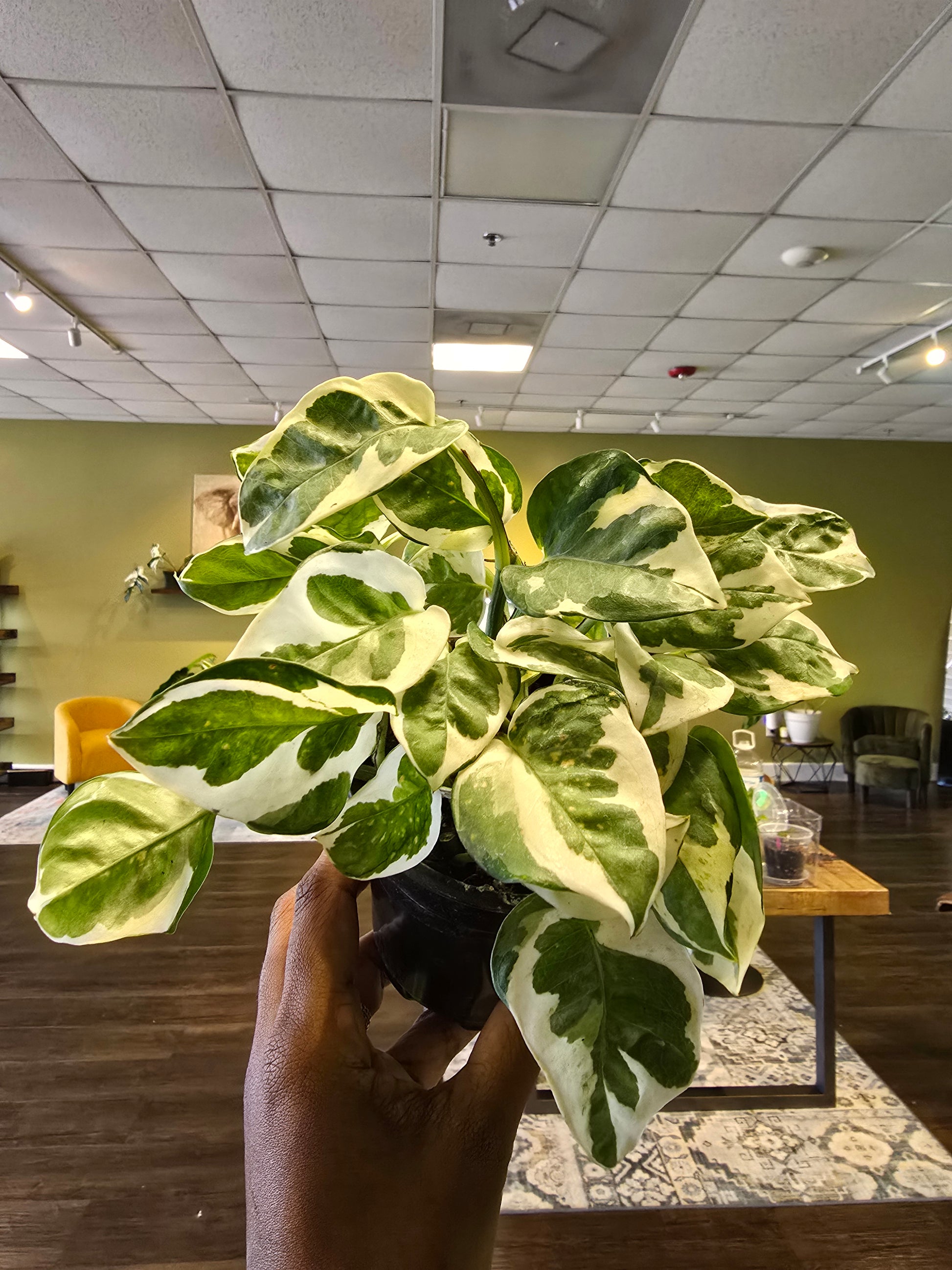 Pearls 'N'Jade Pothos is a compact, variegated pothos variety with green leaves speckled with white and silver. It thrives in bright, indirect light but can adapt to low light. This low-maintenance plant requires moderate watering and well-draining soil. Perfect for indoor spaces, it's easy to propagate and an excellent choice for beginners.