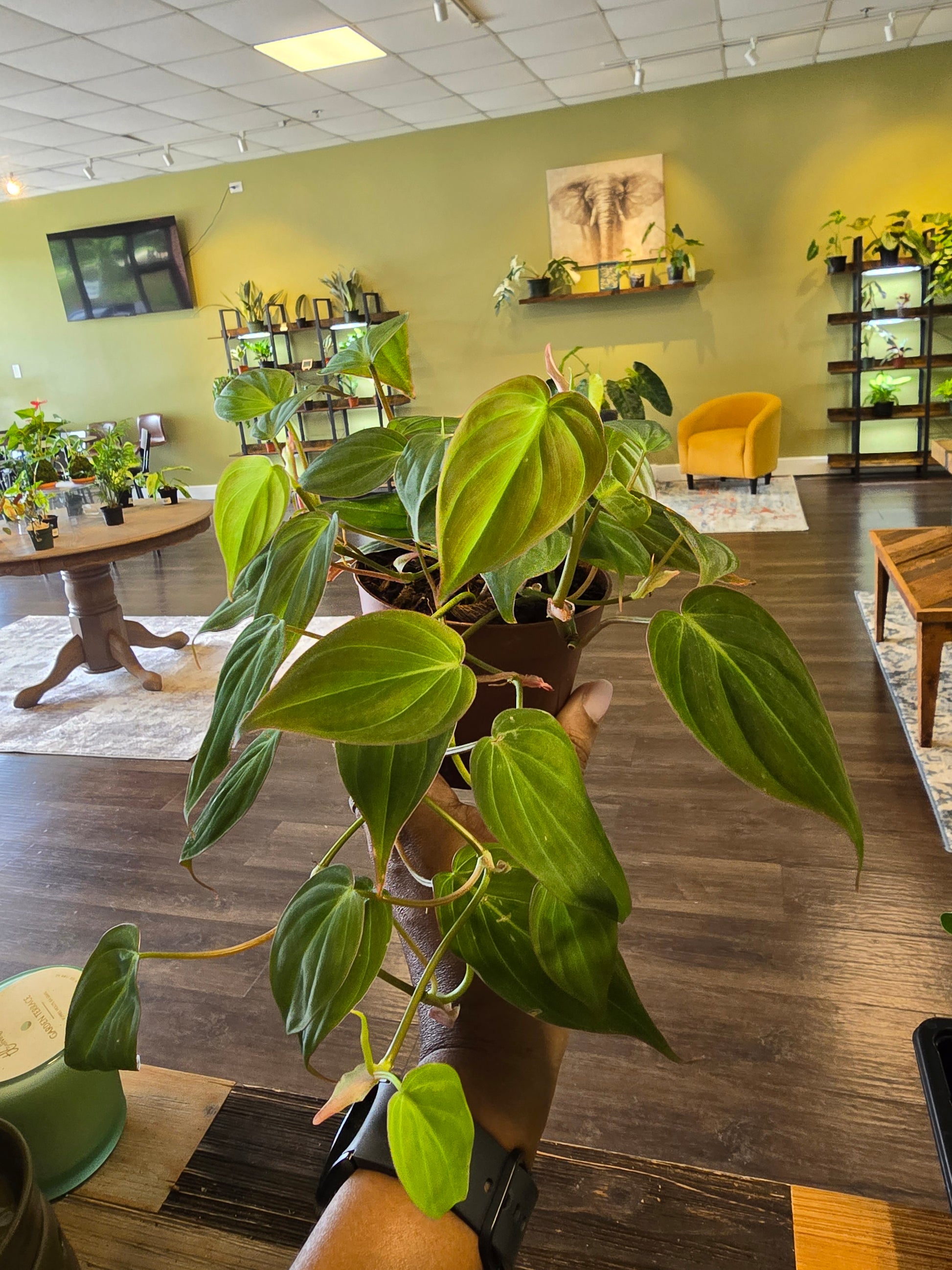 Philodendron micans, also known as Velvet Leaf Philodendron, is a stunning vining plant prized for its soft, velvety leaves. The foliage has a deep green to bronze hue with a subtle purple undertone, and the heart-shaped leaves shimmer in different lighting due to their iridescent texture. This plant thrives in bright, indirect light but can tolerate low-light conditions. It prefers well-draining soil and moderate watering, allowing the top inch of soil to dry out between waterings to prevent root rot. As a trailing plant, it does well in hanging baskets or with a moss pole for climbing. Easy to care for and fast-growing, Philodendron micans is a favorite among houseplant enthusiasts. However, it is toxic to pets and humans if ingested due to calcium oxalate crystals.